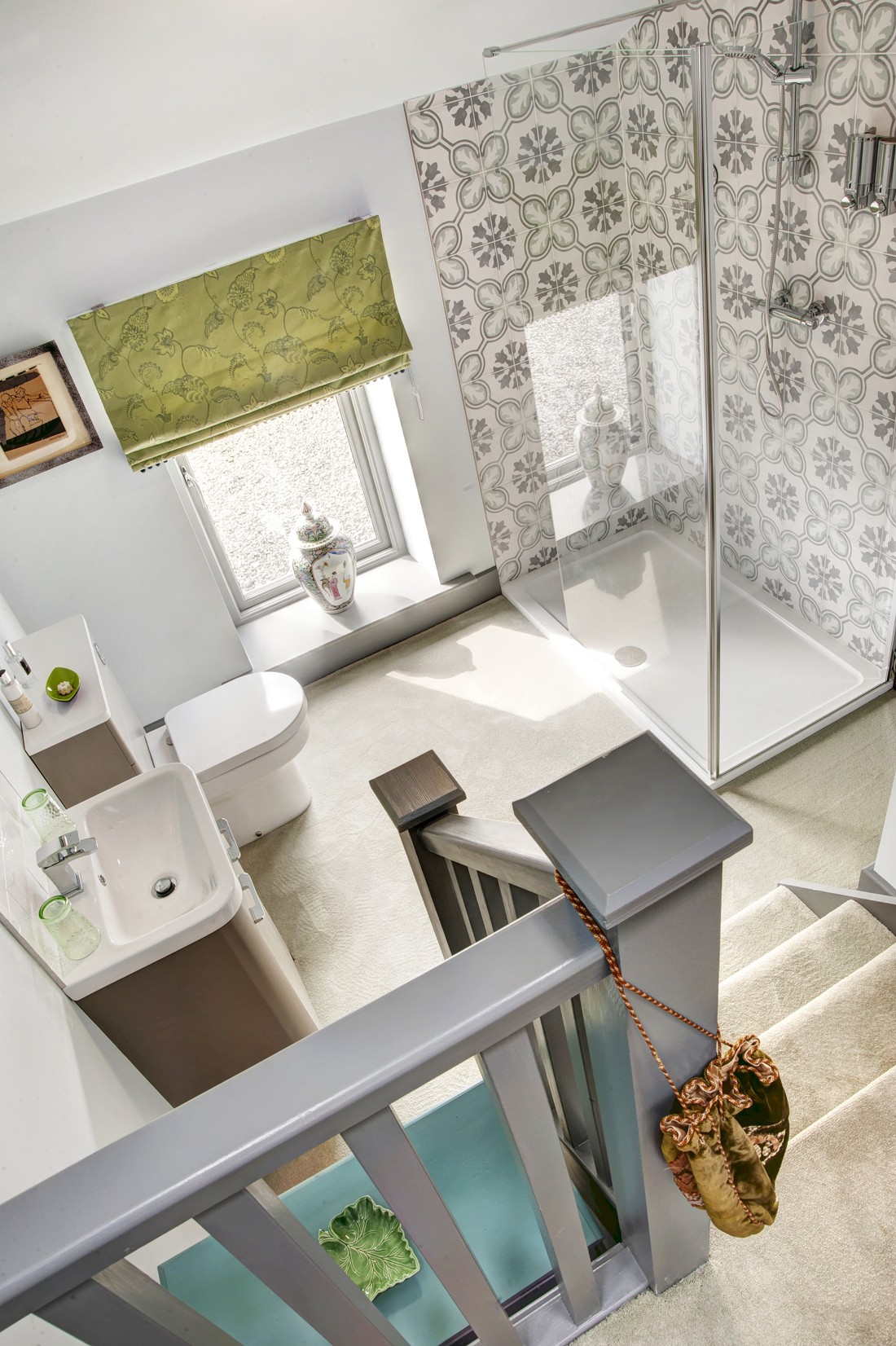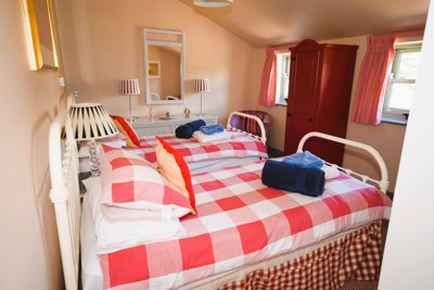 The Green Bedroom has twin 3' beds, a small chest of drawers, a hanging hook and two chairs. Four steps down lead to the en suite bathroom with large shower, heated towel rail, basin, and WC. The en suite bathroom does not have a door.