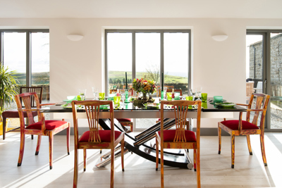 The dining area is separated from the living space by large sandstone arches and boasts floor to ceiling windows which show the fabulous views across the valley. There is a large, extendable dining table with seating for up to 14 guests.