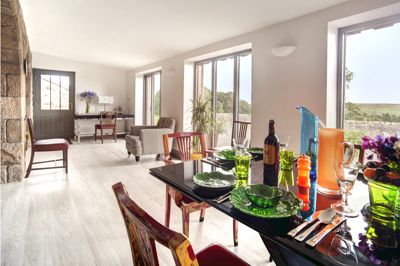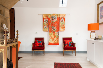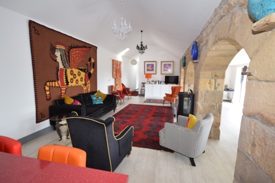 The open plan kitchen, sitting room and dining room (which can seat up to 12) is full of colourful art and curios collected from around the world. It’s ideal for entertaining or simply relaxing by the fire and taking in the spectacular views which can be seen if you look past the Byre’s beautiful original stone arches through the floor to ceiling windows.