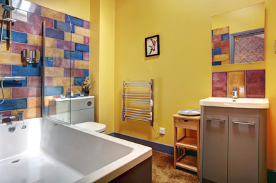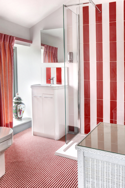 Owner Sabina likes bright colours and her influence can be seen throughout the property from the red kitchen to the oversized wall hanging.