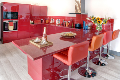 The striking red kitchen has a peninsula island with breakfast bar seating for 4, integrated dishwasher, fridge and freezer. Built-in electric fan oven and grill, four ring induction hob and built in microwave and oven combi.