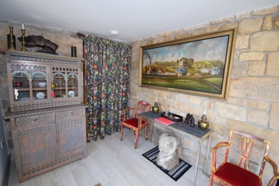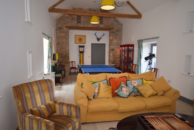 To the left of the front door is a small hall which leads to the cinema and games room. This boasts a large (3m x 1.7m) cinema screen for watching streamed movies, DVD's or TV. This converted barn is lit by two huge industrial lights and by LED lights in each of the many arrow slit windows.