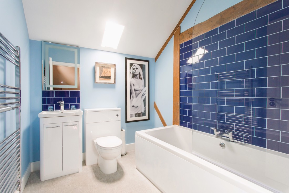 The master bedroom is almost baronial in size with a super king bed with a purple bedhead which matches the two armchairs in the room. For a bit of contrast, the nextdoor bathroom is blessed with a picture of Blondie in her prime.