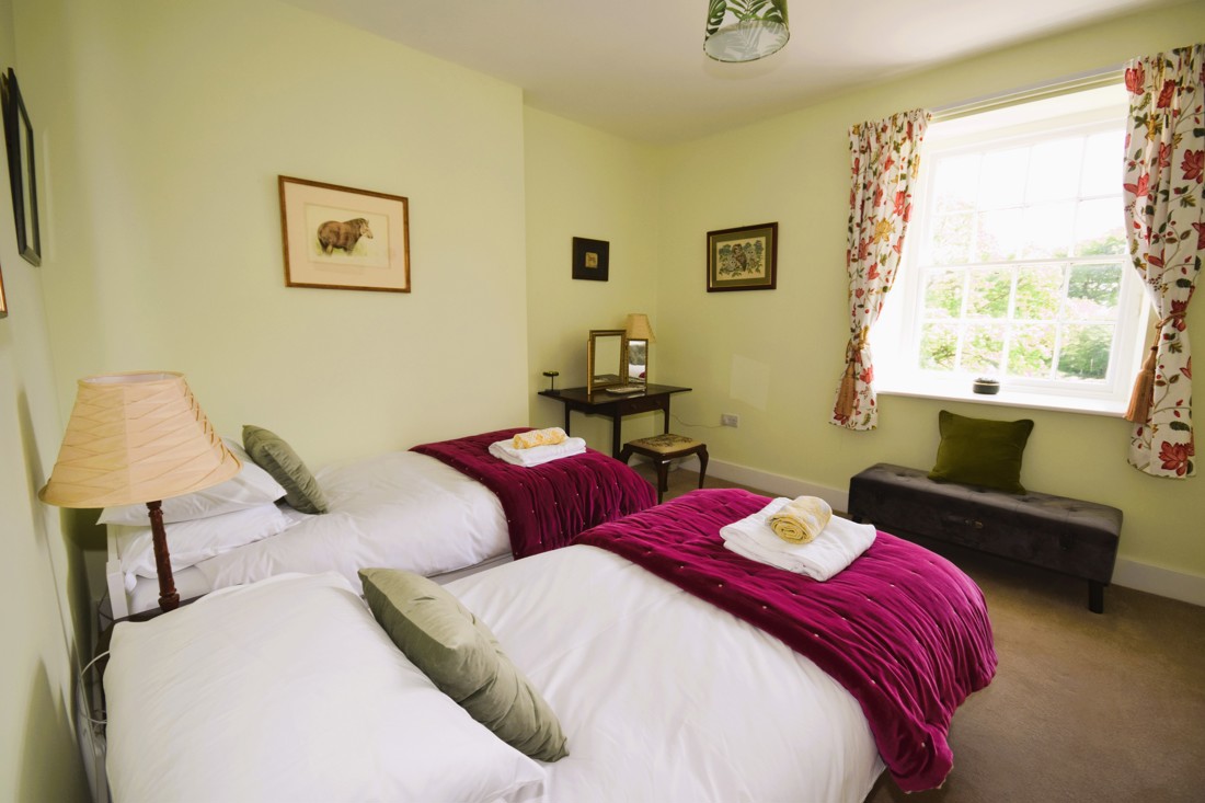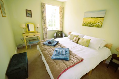 This bedroom has a king size double bed which can be split into 2’6” twins upon request. The room is south facing and has bedside tables and lamps, a dressing table, and armchair. There is built in storage in the passage outside, shared with bedroom two.