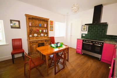 The kitchen is off a small entrance hall. The kitchen is well equipped with a large free standing fridge freezer, a generous sized cooker and 5 ring hob. There is a stripped pine dresser/sideboard and a kitchen table with four chairs.